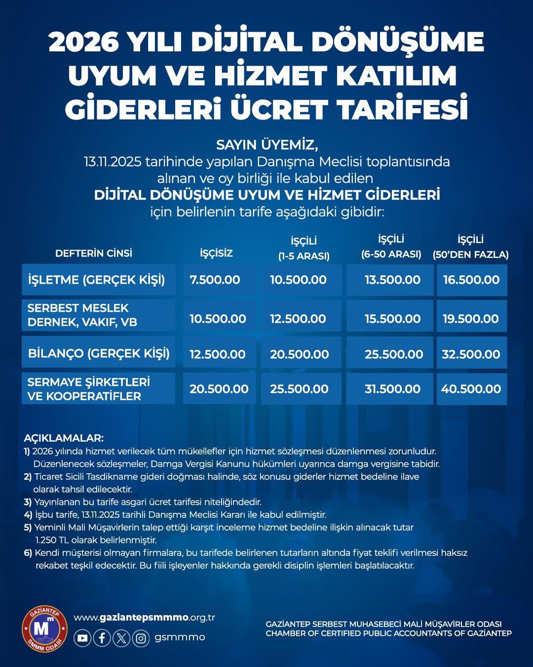 2026 Yılı Dijital Dönüşüme Uyum ve Hizmet Katılım Giderleri Ücret Tarifesi - Gaziantep Muhasebeci | SMMM Mehmet Yıldırım